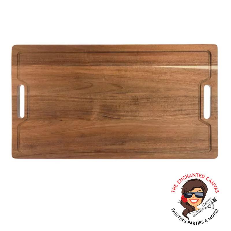 Details: • Solid acacia wood construction • Natural wood grain with varied tones • Built-in juice groove • Side handle cutouts for easy transport • Care & Safety: Food Safe; Hand Wash Only • INCLUDES CUSTOMIZATION